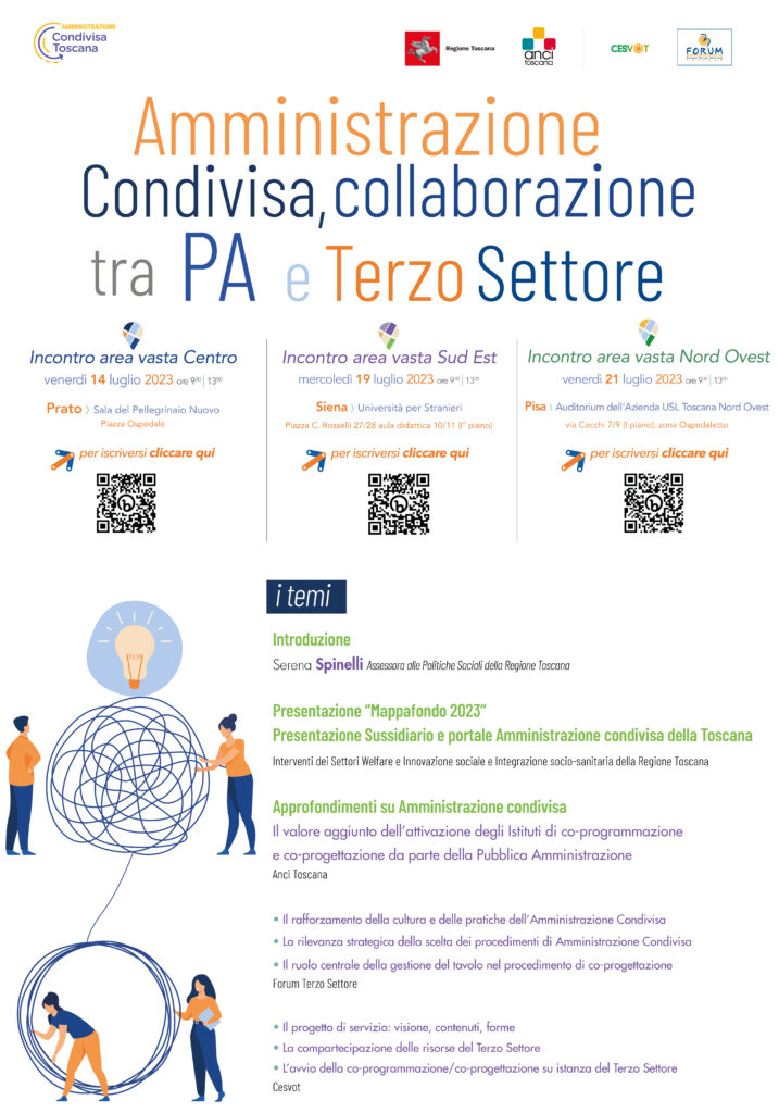 Tre iniziative, partendo dalla presentazione del Sussidiario e del portale Amministrazione condivisa della Toscana, saranno importanti occasioni di approfondimento e di confronto operativo sul tema e sulla rilevanza strategica dell’attivazione degli Istituti di co-programmazione e co-progettazione da parte della Pubblica Amministrazione.